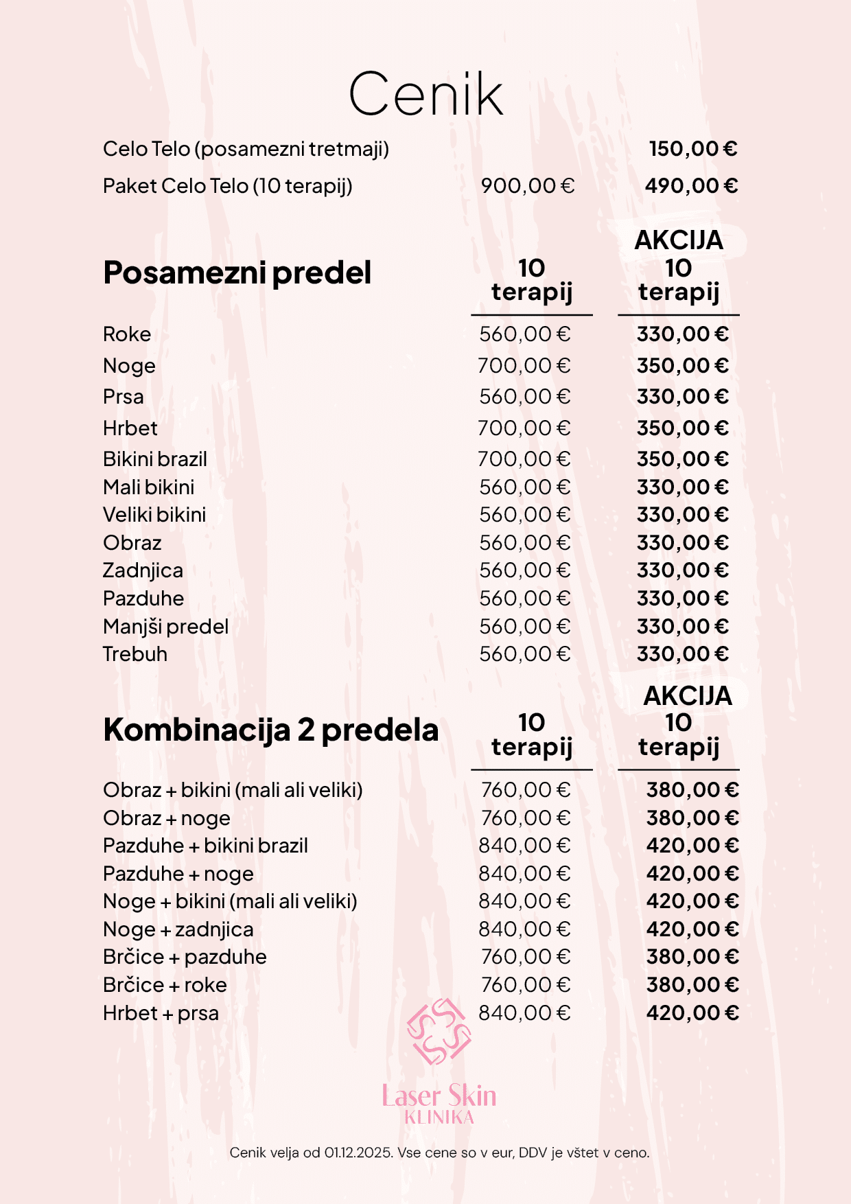 V Laser Skin Kliniki verjamemo, da mora biti kakovostna in trajna nega dostopna vsakomur. Zato smo pripravili cenovno ugodne možnosti za posamezne tretmaje ter izjemno ugoden akcijski paket za celo telo.